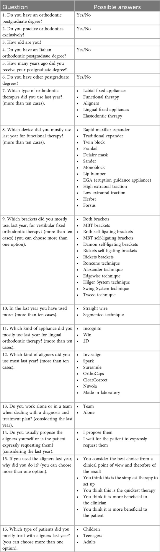 A questionnaire was submitted to 500 Italian Dental offices, in which there was a possibility to receive an orthodontic treatment. Only 317 answers could be included in this study. The dentists were asked to complete an anonymous questionnaire (Table 1) electronically distributed, in Italian, between July and August 2022.