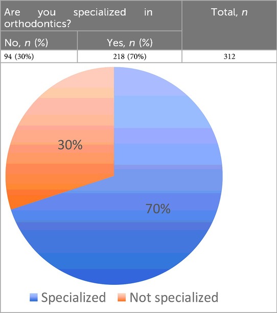 1. Among the respondents, 70% (218/312) were specialized in orthodontics, while 30% (94/312) were not (Table 2).