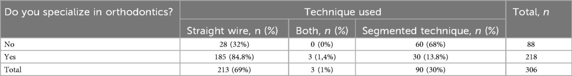 Specialization was associated with technique choice (χ2 = 89.68, df = 2, p < 0.0001; Cramer's V = 0.54): specialists predominantly used straight wire, non-specialists mainly segmented tecnique (Table 3).
