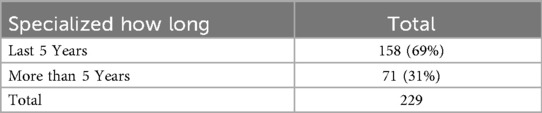 Among specialists, 69% (158/229) obtained specialization ≤5 years ago and 31% (71/229) > 5 years (Table 4; Figure 1).