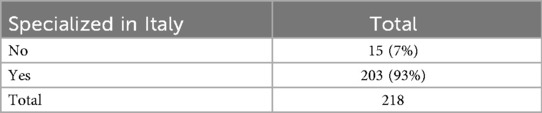93% (203/218) trained in Italy and 7% (15/218) abroad (Table 5; Figure 2).