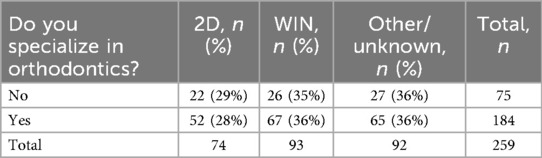 Table 6. Distribution of lingual orthodontic techniques (2D, WIN, other/unknown) used by specialists and non-specialists.