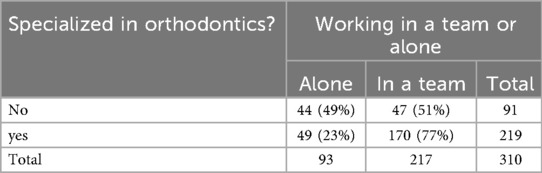 Table 7. Comparison between specialists and non-specialists in orthodontics regarding their preference for working alone or in a team.