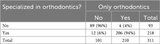 94% (206/218) of specialists reported only orthodontics, vs. 4% (4/93) of non-specialists (Table 8).