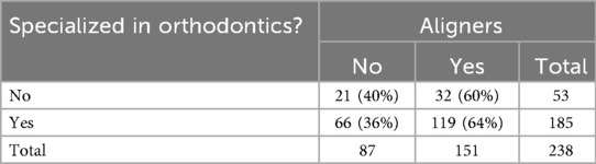2. Which orthodontic techniques are the most used by those specialized and those not specialized in orthodontics? A significant association was found between specialization status and the orthodontic technique used (χ2 = 89.68, df = 2, p < 0.0001). Specialists predominantly used the straight wire technique, whereas non-specialists mainly adopted the segmented technique (Table 3).