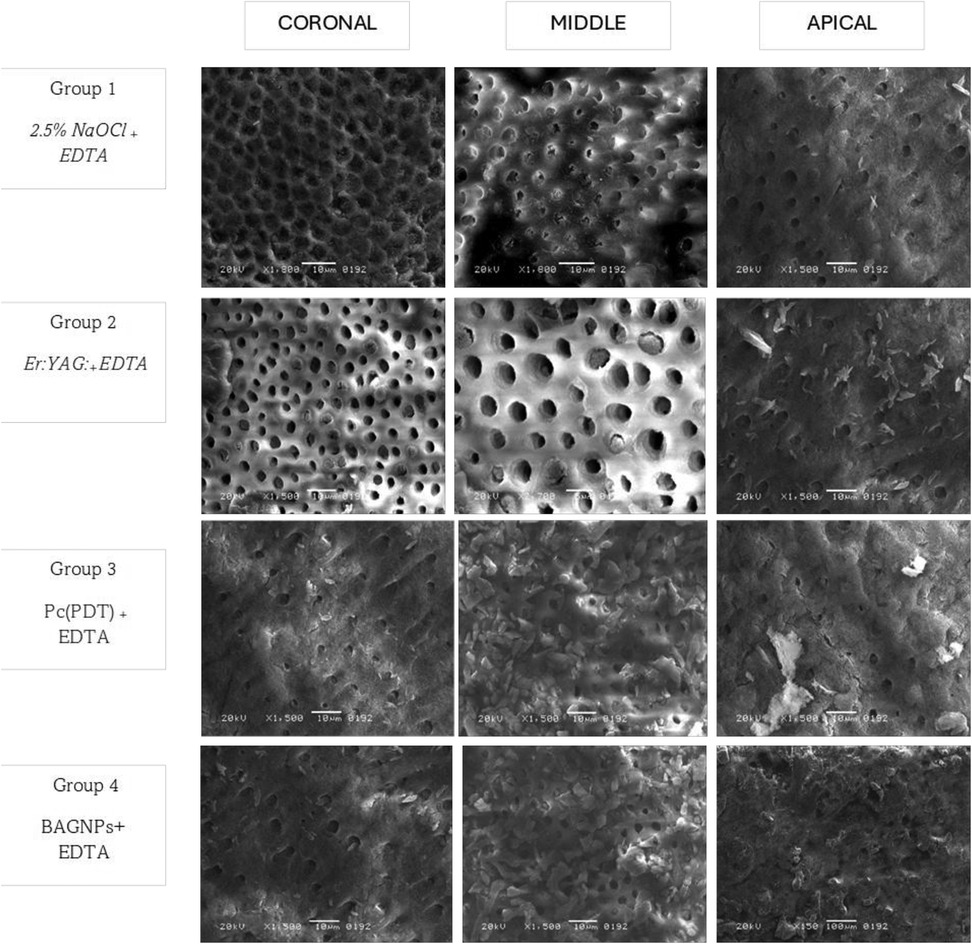 Figure 1. SEM micrograph of canal wall irrigated with 2.5% NaOCl + EDTA. The SEM image shows that dentinal tubules are open, and the SL has been partially removed in the coronal, middle, and apical thirds of the dentin. Areas of debris and smear layer are observable. Canal dentin irrigated with Er: YAG: +EDTA pronounced open dentinal tubules. Radicular canal irrigated with PC + EDTA and BAGNP + EDTA SEM images captured indicate the presence of SL and debris that covered the walls, revealing only a few dentinal tubules observed open in all three thirds (coronal, middle, and Apical).