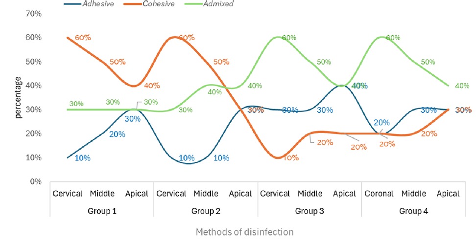 Figure 2 displays the percentage of failure modes for each investigated group. Groups 1 and 2 presented cohesive failures the most. Whereas Groups 3 and 4 exhibited admixed failures predominantly.