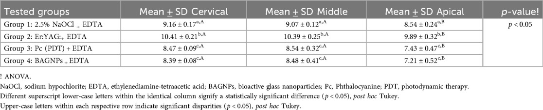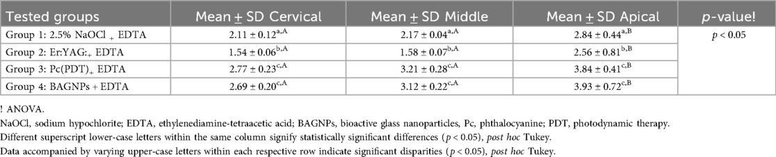 SL removal from the post space after using different post space disinfection protocols is displayed in Table 1. The cervical third of Group 2 (Er: YAG:+ EDTA) treated teeth presented the highest SL removal (1.54 ± 0.06). Whereas, the apical third of Group 4 (BAGNPs+ EDTA) samples revealed the lowest SL removal (3.93 ± 0.72). Comparison among different tested groups exhibited that SL removal in Group 3 [Pc (PDT)+EDTA] (Cervical: 2.77 ± 0.23, Middle: 3.21 ± 0.28, and Apical: 3.84 ± 0.41) and Group 4 (Cervical: 2.69 ± 0.20, Middle: 3.12 ± 0.22, and Apical: 3.93 ± 0.72) presented comparable scores at all three-thirds of the canal (p > 0.05). However, Group 1 (2.5% NaOCl + EDTA) (Cervical: 2.11 ± 0.12, middle: 2.17 ± 0.04, apical: 2.84 ± 0.44) and Group 2 treated teeth (Cervical: 1.54 ± 0.06, middle: 1.58 ± 0.07, and apical: 2.56 ± 0.81) presented significant difference from each other and other tested groups (p < 0.05) (Figure 1).