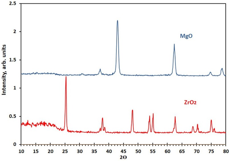 where D is the crystallite size (nm), K = 0.9 (Scherrer constant), λ denotes the x-ray wavelength, β_s represents the full width at half maximum (FWHM) of the most intense diffraction peaks, and θ is the Bragg angle. On the basis of this analysis, the average crystallite sizes were determined to be 17.7 ± 2.9 nm for MgO and 26.1 ± 4.9 for ZrO2, as presented in Figure 1.