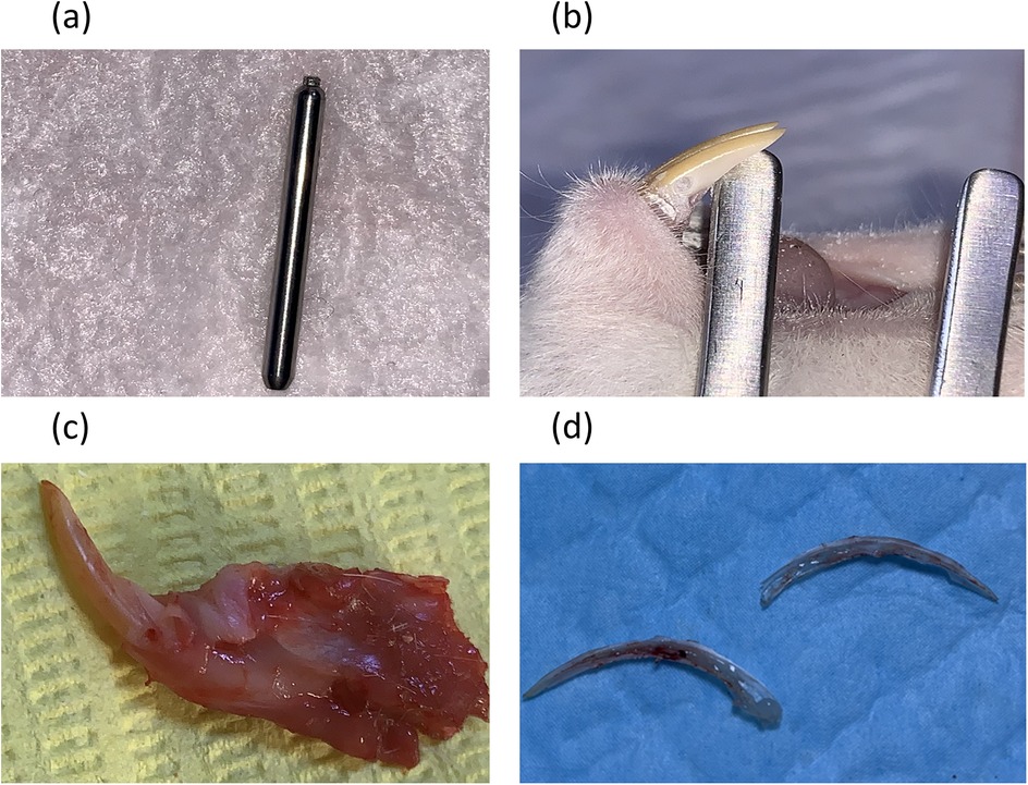 Figure 1. Cavity preparation and teeth dissection procedures. (a) A Diamond Bur Komet® PrepMarker® instrument (DM05) was used to prepare the cavities. (b) A non-exposure cavity. (c) A cavity with pulp exposure. (d) The pulp after vertical splitting of the mandibular incisor.
