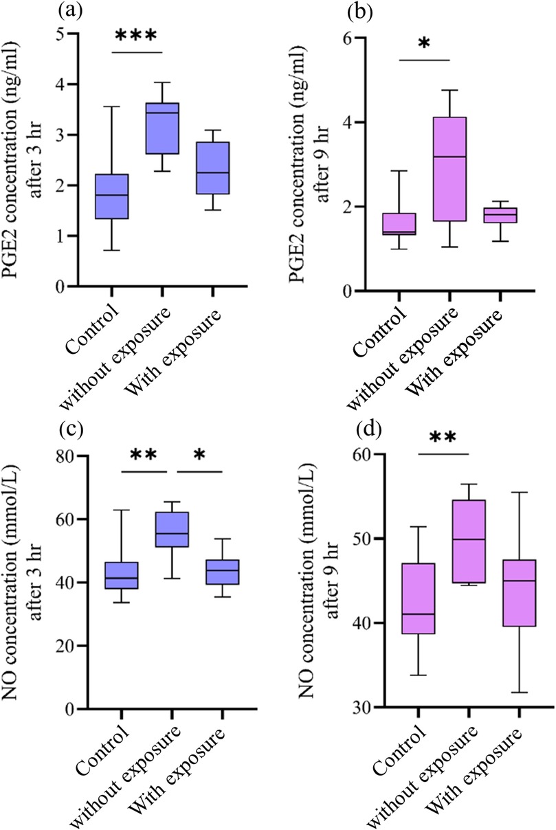 Figure 2. Effect of cavity preparation on PGE2 (ng/mL) and NO (µmol/L) concentrations between the controls and the groups with cavities without and with pulp exposure at two time points. The box plots represent median value (horizontal line), interquartile range (box), and the minimum and maximum values (vertical lines). (a,b) The PGE2 concentrations in the control group, non-exposed cavity group, and cavity with pulp exposure group, after 3 h and 9 h, respectively. (c,d) The concentration of NO in the same groups after 3 h and 9 h, respectively. Statistical significant difference in the multiple comparison test is represented by * for p ≤ 0.05, ** for p ≤ 0.01, and *** for p ≤ 0.001.