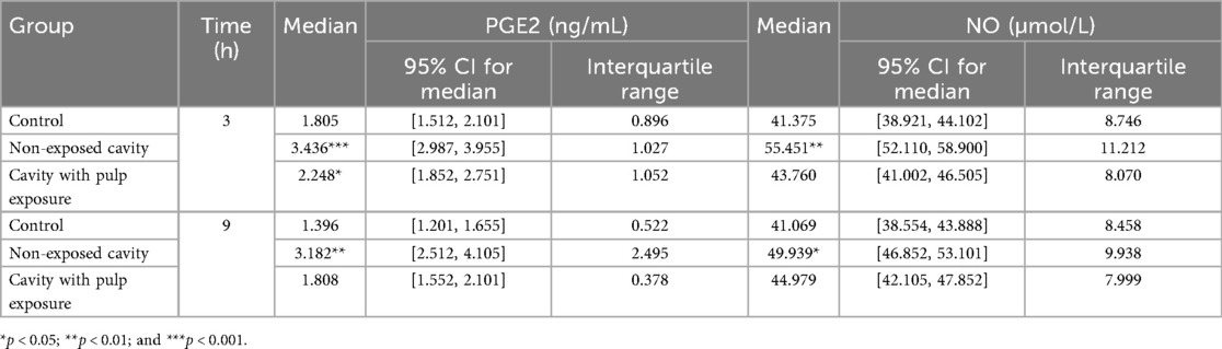 The collected data were found not to be normally distributed in the Shapiro–Wilk test (p ˃ 0.05); therefore, all the concentration measurements of PEG2 and NO are presented as a median and interquartile range (Table 1). The medians for both the PGE2 and NO concentrations were higher within the cavity groups in comparison to the controls. Moreover, the medians for these biomarkers were higher in the groups with cavities without pulp exposure than in those with pulp exposure. The concentrations of PGE2 and NO after 9 h were slightly decreased compared with their values after 3 h for all groups, except for NO concentration in the cavity with pulp exposure group, in which the concentration was slightly higher.