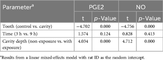 The statistical analysis was performed using IBM SPSS Statistics for Windows, Version 28.0 (Released 2021; IBM Corp., Armonk, NY, USA). The Shapiro–Wilk test was used to determine the normality of the results at p ≤ 0.05. A multivariate analysis was used to identify the effects of tooth type (control vs. cavity), depth of cavity (without vs. with exposure), and time (3 h vs. 9 h) on the levels of PGE2 and NO. This approach was preferred over a traditional ANOVA due to its capacity to handle repeated measures, missing data, and interanimal variation while preserving statistical power. Furthermore, the Kruskal–Wallis test was used to compare the levels of these markers at p ≤ 0.05 between the controls (n = 20) and both cavity type groups (n = 10 for each) at each time point. In addition, Spearman’s correlation assay was used to identify the relationship between the two biomarkers (PGE2 and NO). We calculated the effect sizes and confidence intervals to quantify the magnitude and precision of the observed differences. For the between-group comparisons (e.g., non-exposed vs. exposed), the non-parametric r effect size was derived from the Z-statistic of the Mann–Whitney U-test: r = Z/√N, where N is the total number of observations. The effect sizes were interpreted as follows: r = 0.10 was small, 0.30 was medium, and 0.50 was large. The common language effect size (CLES) was calculated to indicate the probability that a randomly selected score from one group would be greater than a score from another group. Furthermore, the 95% confidence intervals (CIs) for the medians were estimated using bootstrapping with 5,000 resamples. All the effect sizes and CIs were calculated using the “rstatix” and “boot” packages in R software (version 4.3.1), respectively. A post hoc power analysis based on the observed effect size for the primary outcome (PGE2 level) indicated a power of 92% (α=0.05, n = 10/group), reducing the risk of Type II error for this key comparison.