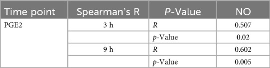 Table 3. Spearman's correlation analysis of PGE2 and NO at the two time points in the study (3 and 9 h).