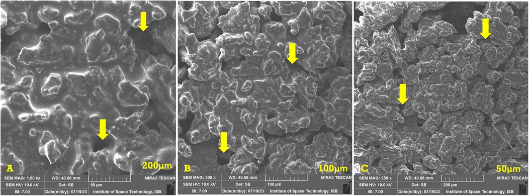 Figure 2. SEM images of the basic hydrogel. The yellow arrows indicate the pores in the hydrogel. (A) Magnification of ×1,000, bar = 50 µm. (B) Magnification of ×500, bar = 100 µm. (C) Magnification of ×250, bar = 200 µm.