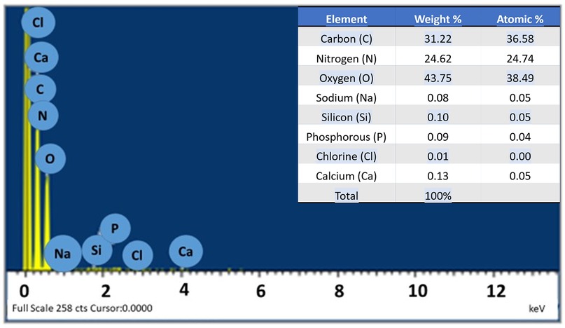 Figure 2 shows the energy dispersive x-ray spectroscopy (EDS) (LEO 435VP, Carl Zeiss™ AG (Jena, Germany) spectrum of the prepared hydrogel which confirms the presence of carbon, nitrogen, oxygen, sodium, silicon, phosphorus, chlorine, and calcium in it. The percentages of the various elements present in the hydrogel are also shown in Figure 3 as well.