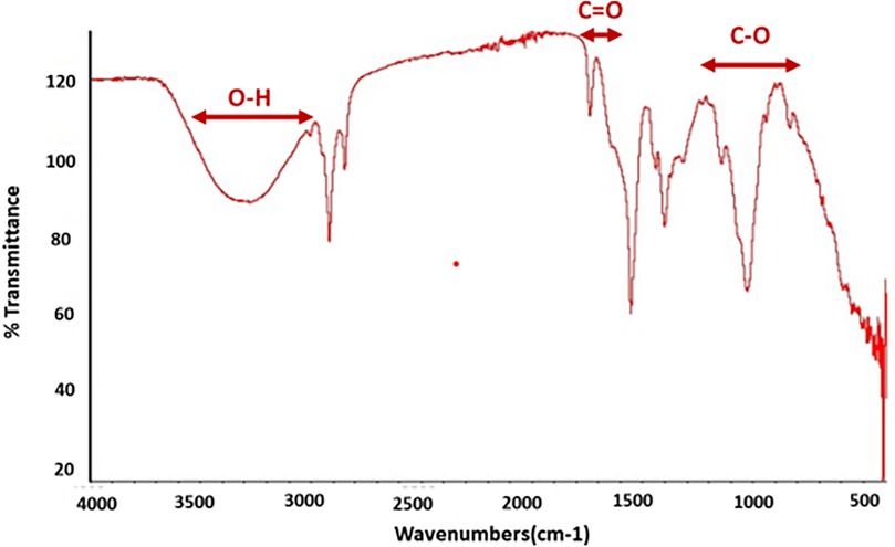 The FTIR spectrum, as shown in Figure 4, was used to identify the functional groups in the prepared basic composition hydrogel. The broad band in the region of 3,200–3,600 cm−1, which corresponds to O–H stretching vibrations, indicated the presence of hydrogen bonds in the –OH group, which could be due to the hyaluronic acid and water present in the hydrogel matrix (38). The band in the region of 1,000–1,300 cm−1 is due to C–O stretching vibrations, which are also due to hyaluronic acid (39). The presence of a carbonyl group (C=O) is indicated by a sharp peak around 1,725–1,750 cm−1. This group was present due to the acrylic acid component of carbomer (40). Thus, the FTIR spectrum confirms that the expected functional groups, namely, –OH, C=O, and C–O, were present in the prepared hydrogel. These groups indicate the presence of hyaluronic acid, carbomer, and water in the hydrogel.