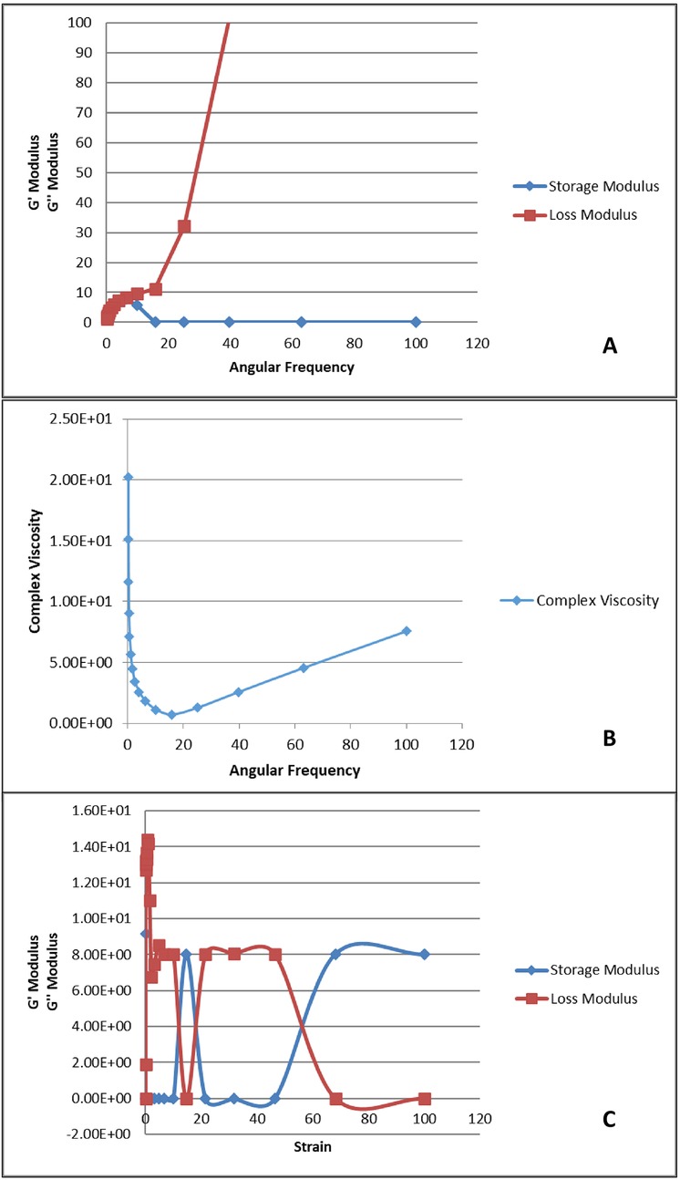 Figure 5. Rheological analysis of the prepared hydrogel. (A) Angular frequency vs. storage and loss modulus; (B) angular frequency vs. complex viscosity; (C) strain vs. storage and loss modulus.