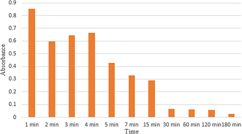 The hydrogel depicts strong adhesion with mucosa. Figure 6 depicts the values of absorbance at each time interval indicating bioadhesion of basic hydrogel to mucosa. The absorbance decreased over time with the highest absorbance value recorded in the first minute (0.85283 ± 0.935268) and lowest absorbance value at 180 min (0.02617 ± 0.028903).