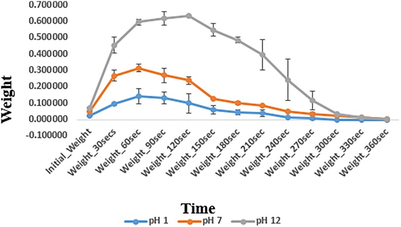 The swelling and degradation behavior of the basic hydrogel indicated by changes in weight of hydrogel (mean ± standard deviation) at different pH levels is depicted in Figure 7. The swelling/degradation pattern of hydrogel at pH 1 group and pH 7 group is parallel i.e., the hydrogel showed increase in weight up to 60 s indicating swelling/water uptake, followed by a gradual drop in weight, indicating its degradation in 360 s. In pH 12 group, the hydrogel swelled for 120 s and then degraded eventually. Degradation of the hydrogel at different pH also shows a similar pattern. The synthesized hydrogel degraded within 360 s at all three pH groups i.e., pH 1, 7, and 12. A statistically significant difference in swelling and degradation behavior of the hydrogel indicated by changes in weight of hydrogel, was observed within and between different pH groups at planned time intervals. Pairwise comparison showed a statistically significant difference in weight of the hydrogel at planned time intervals between different pH groups (p-value <.05) except between pH 1 and pH 7 groups (p-value > 0.05).