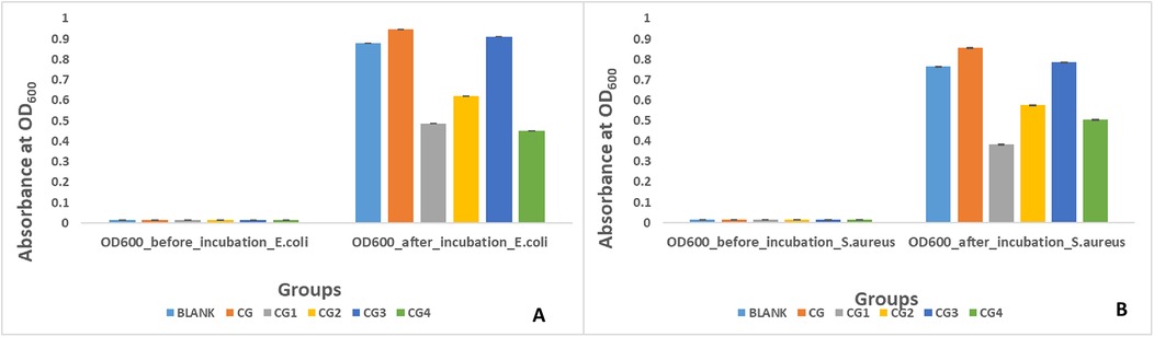 Antibacterial activity against E. coli was exhibited by three out of the five variants of the prepared hydrogels as shown by turbidity/absorbance at 600 optical density in Figure 8A. Highest antibacterial activity against E. coli was exhibited by group CG4 (0.45 ± 0.04), followed by group CG1 (0.48 ± 0.02), and group CG2 (0.62 ± 0.02). A statistically significant difference (p-value < 0.05) in antibacterial activity of the hydrogels against E. coli was observed within and between all the experimental hydrogel groups. Pairwise comparison showed a statistically significant difference in antimicrobial activity against E. coli between all hydrogel groups used in this study except between blank and CG, blank and CG3, CG and CG3, and CG1 and CG4 (p-value > 0.05).
