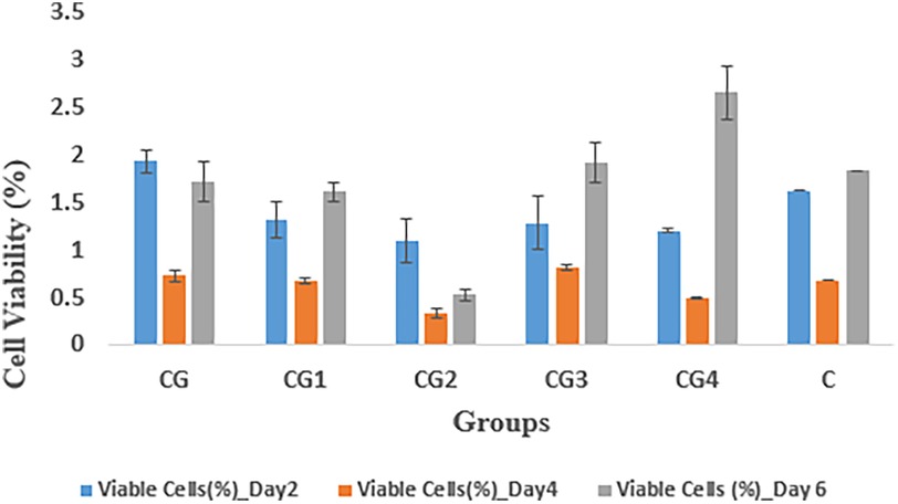 The cytocompatibility of the hydrogel variants was determined by calculating the percentage of viable fibroblasts after observing the samples over a period of 6 days, as shown in Figure 9. On day 2, the highest cellular viability was demonstrated by CG and CG2, which exhibited the lowest cellular viability when compared to control C. On day 4, CG3 exhibited the highest cellular viability and on day 6, the highest cellular viability was exhibited by CG4. CG2 consistently exhibited the lowest cellular viability throughout the study when compared to control C and this can be attributed to impurities in the samples either during preparation or during testing, leading to altered results (54). A statistical analysis also revealed significant differences between CG2 and the other groups. The cytocompatibility of the hydrogel and its variants can be attributed to the various components in its formulation. Zhang et al. determined that their zwitterionic hyaluronic acid-based hydrogels exhibited excellent biocompatibility, which increased over time (57). Similarly, Hayati et al. concluded that carbomer hydrogels exhibited biocompatibility and improved tissue perfusion and decreased necrotic tissue in burn wounds (58). Salehi et al. used EDTA in their chitosan hydrogel to enhance wound healing and observed positive results (59). Johnson determined that carbohydrazide-modified hyaluronic acid hydrogel exhibited high cellular viability and increased cellular growth (60). The ZnO-NP/Chitosan/β-Glycerophosphate composite hydrogels synthesized by Huang et al. exhibited more than 90% cell viability of gingival fibroblasts (61).