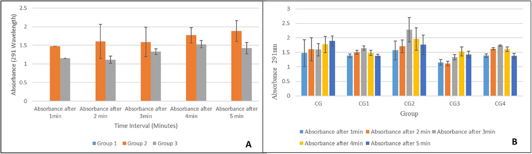 The evaluation of the release kinetics of the exosomes from the prepared hydrogel groups was conducted using UV-visible spectroscopy by utilizing the dissolution method using PBS with pH 7.4 (30). Then, 1 g of exosome-loaded hydrogel was added to 15 mL of buffer solution in a beaker with constant agitation at 50 rpm using a magnetic stirrer at room temperature. Subsequently, 2 mL of elutes was removed at planned time intervals, i.e., 1, 2, 3, 4, and 5 min, followed by replacement with an equal volume of PBS at each interval. Finally, a UV spectrophotometer was used to measure the amount of exosomes released at the time intervals in the collected elute samples (31). The absorbance was measured at 291 nm after a solution containing exosomes showed a peak at 291 nm. This can be attributed to the various proteins present in the structure of exosomes, which show absorbance in the range of 280–300 nm (32). To ensure reliability and reproducibility, the test was conducted three times.
