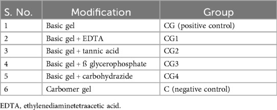 The antimicrobial agents used to create the hydrogel variants included EDTA, tannic acid, β-glycerophosphate, and carbohydrazide. To prepare the hydrogel variants, first, the required antimicrobial agent solutions were prepared by dissolving 0.5 g of the antimicrobial agent powder in 5 mL of deionized water in a beaker covered with aluminum foil, which was then stirred at 650 rpm for 30 min at room temperature (25°C) on a hot plate stirrer. Then, 150 µL of the prepared antimicrobial agent solution was added to 2 mL of the basic composition gel in a beaker and stirred again at 400 rpm for another 2 min on a hot plate stirrer at 25°C to prepare the variant hydrogel group. The details of the prepared hydrogel groups used in this study are given in Table 1.