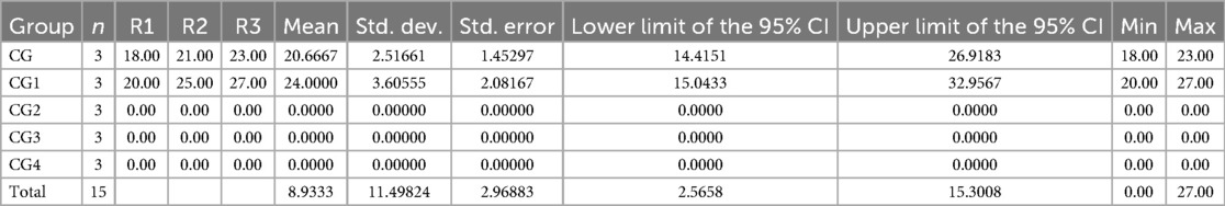 Table 2 shows the raw values and means and SDs of the ZOIs of the groups against C. albicans.