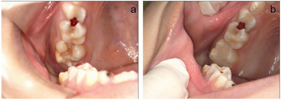 The entire clinical procedure was carried out by a single trained pediatric dentist. Before tooth preparation, local anesthesia was administered using 2% lidocaine (Lox 2%, Neon laboratories) with 1:80,000 adrenaline for nerve blocks, and the tooth was isolated with a rubber dam. The efficacy of anesthesia was confirmed by the absence of a painful response to initial tooth preparation. In cases of inadequate anesthesia, supplemental techniques (e.g., intraligamentary) were employed to ensure patient comfort, following protocols adapted for hypersensitive MIH teeth. Hypomineralized enamel at the margins of the cavity was selectively removed using high-speed, water-cooled diamond fissure burs. Carious dentin tissue was removed with a steel round bur using a low speed with micromotor. To ensure complete removal of MIH-affected tissue while preserving healthy enamel, a caries detector dye (Sable™ Seek, Ultradent) was applied according to the manufacturer's instructions. Stained areas were re-prepared until no dye retention was observed. A pulp capping material (Calcimol LC, VOCO GmbH, Cuxhaven, Germany) was applied in cases where the remaining dentine thickness was estimated to be <2 mm. Figure 1 shows the restoration of MIH-affected PFMs using composite resin.