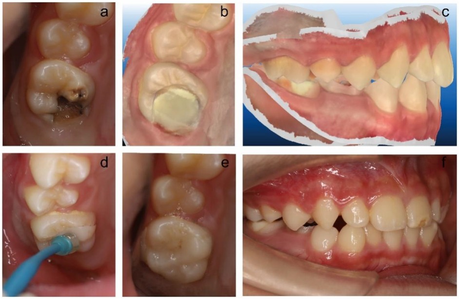 Figure 2. The restoration process of tooth 16 using resin-infiltrated ceramic CAD/CAM onlays. (a) Preoperative situation of an MIH-affected tooth 16 with caries. (b) A scan of the occlusal surface of 16 after tooth preparation. (c) A scan of occlusal contacts of normal occlusion in the intercuspal position. (d) Cementation of restoration. (e) Examination of margin and proximal contact. (f) Examination of occlusion.