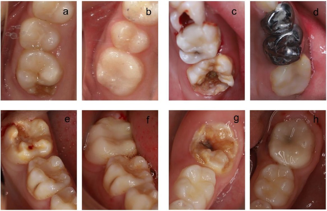 Figure 3. The restoration of teeth using resin-infiltrated ceramic CAD/CAM onlays. (a,b) Preoperative and postoperative (24 months post-op) situation of an MIH-affected tooth 16. (c,d) Preoperative and postoperative (24 months post-op) situation of an MIH-affected tooth 26. (e,f) Preoperative and postoperative (24 months post-op) situation of an MIH-affected tooth 36. (g,h) Preoperative and postoperative (24 months post-op) situation of an MIH-affected tooth 46.