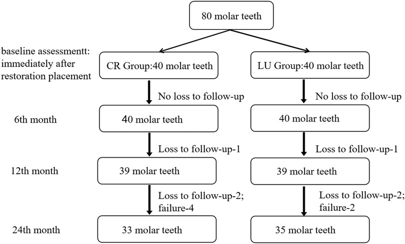 Between January and August 2021, 79 pediatric patients (mean age: 8.6 years, range: 7–11) with a total of 80 severely affected permanent first molars (PFMs) were recruited. Children's cooperative behavior was assessed prior to enrollment using the Frankl Behavior Rating Scale (FBRS) (20). Only children rated as 3 (positive) or 4 (definitely positive) were included; for those with dental anxiety, non-pharmacological behavior management strategies (e.g., tell-show-do) were uniformly applied (20). The sample size was based on the difference in restoration survival rates reported in previous literature (12), with a power of 0.8, a significance level of 0.05, and an anticipated attrition rate of 20%. This resulted in a target of 40 restorations per group (total N = 80).