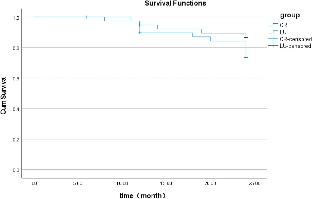 Figure 5. Kaplan–meier survival analysis of the CR group and LU group. Kaplan–Meier analysis and Log-rank test over a 24-month period demonstrated that the LU Group exhibited a marginally higher survival rate of restorations compared to the CR Group, but this difference was not statistically significant (p = 0.17).