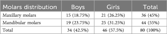 The study included 80 first molars diagnosed with MIH (Molar Incisor Hypomineralization) from 79 pediatric participants aged 7–11 years. This cohort consisted of 34 boys and 45 girls. Table 1 presented the distribution of molars included in the analysis.