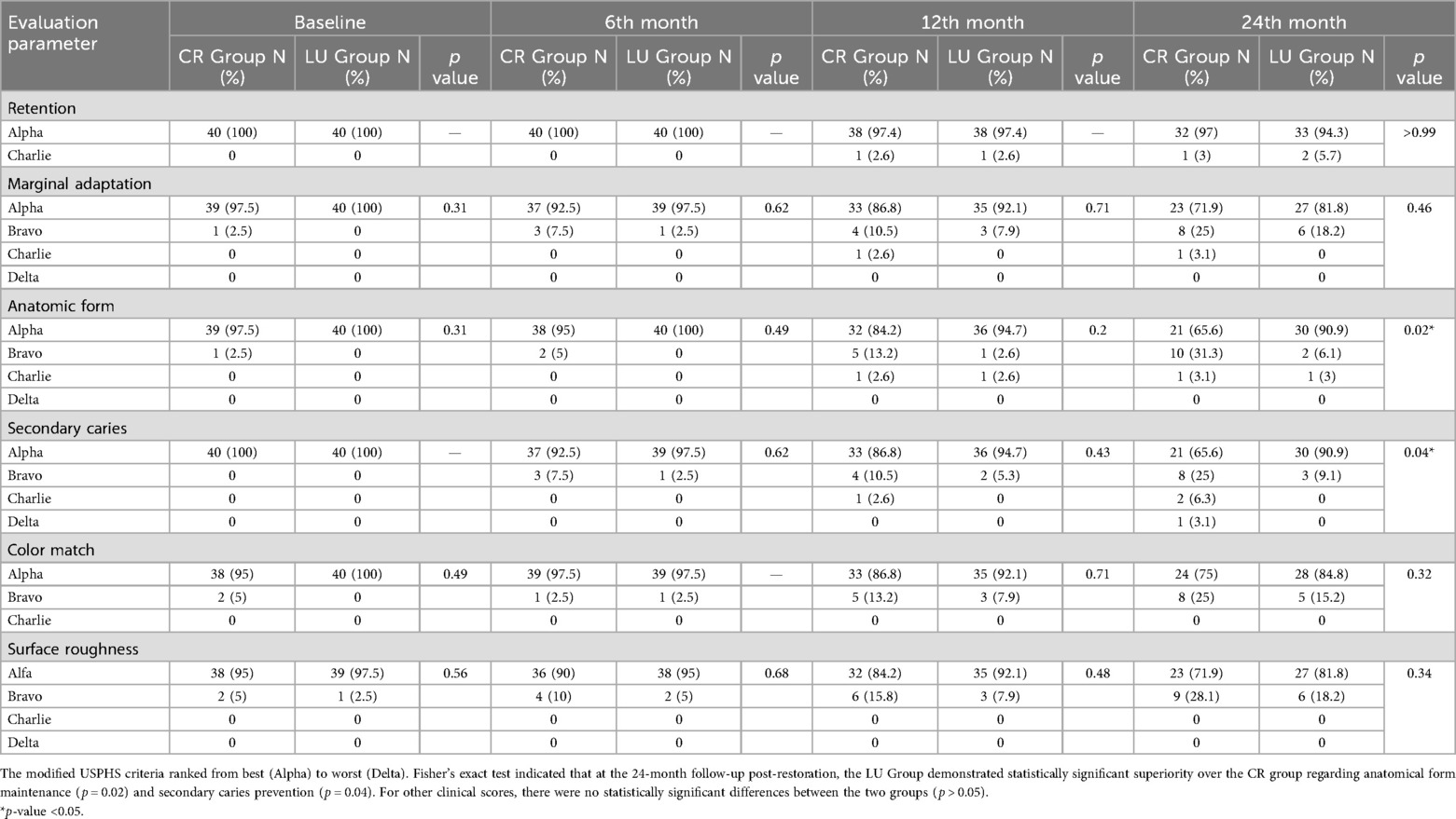 Chi-square test and Fisher's exact tests demonstrated no statistically significant differences (p > 0.05) between the CR and the LU groups in restoration retention rates, marginal adaptation, color match, and surface roughness over the 24-month follow-up period. However, at the 24-month follow-up, the LU Group demonstrated superior restorative outcomes compared to the CR Group in terms of anatomic form (p = 0.02) and resistance to secondary caries (p = 0.04). Detailed results for clinical evaluation at 6M, 12M, and 24M follow-up are summarized in Table 2.