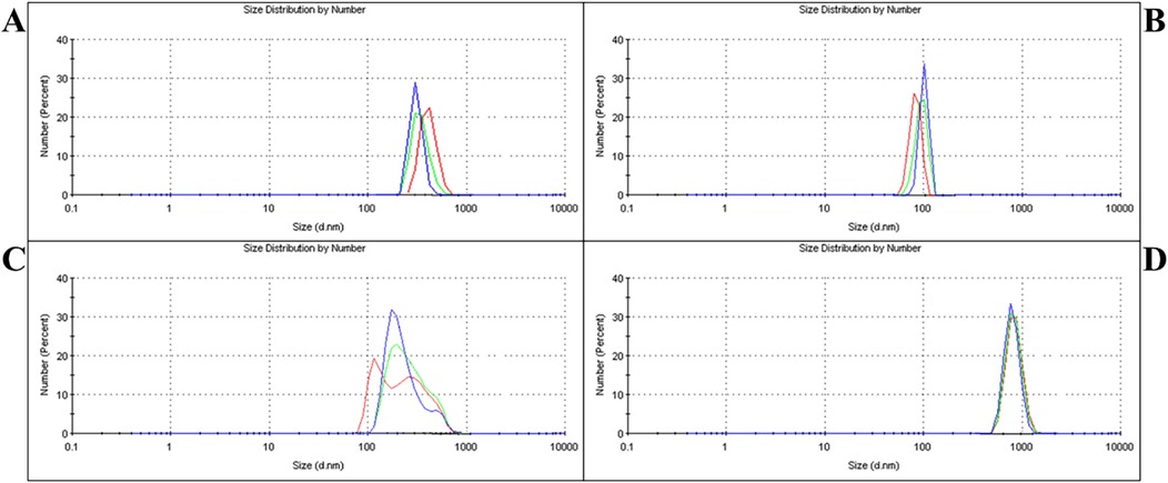 Figure 1. PSD analysis of different groups. (A) – Group A: submicron showed an average particle size of 576.9 nm after single-step milling. (B) – Group B: nano reached 92.4 nm following two-step milling. (C) – Group C: the hybrid had an average size of 352.6 nm, achieved by blending micro- and nano-sized powders. (D) – Group D: control exhibited the largest particle size at 936.8 nm.