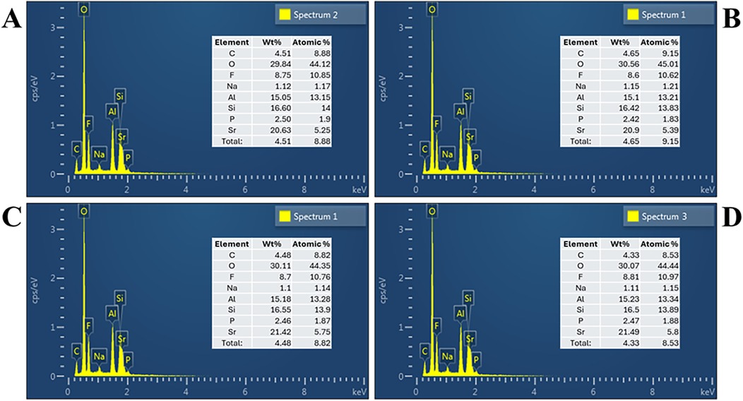 The elemental composition of the experimental and control GICs was analyzed using EDX, and the results are presented in Figures 3A–D. All four groups exhibited similar elemental profiles, primarily composed of oxygen (O), silicon (Si), aluminum (Al), fluoride (F), strontium (Sr), phosphorus (P), sodium (Na), and carbon (C), consistent with the expected components of conventional fluoroaluminosilicate-based GICs.