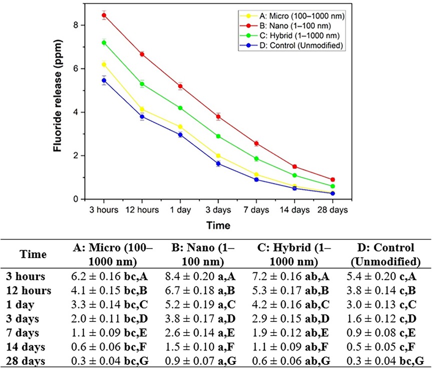 Results: Group B (nano) exhibited the highest fluoride (8.4 ± 0.2 ppm at 3 h) and calcium ion release (1.3 ± 0.08 ppm at 3 h), and the most alkaline pH (6.6 ± 0.09 at day 28). Particle size reduction significantly increased ion release and pH over time but reduced compressive strength (99.02 ± 4.01 MPa) and prolonged setting time (426 ± 10.14 s). The hybrid group (Group C) demonstrated a balanced profile between ion release and mechanical strength, with no chemical alteration observed across groups.