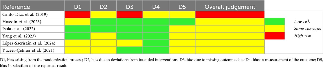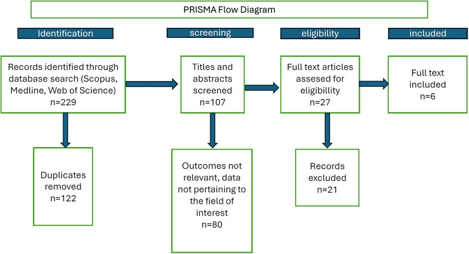 The database searches yielded 81 (MEDLINE), 91 (Scopus), and 57 (Web of Science) records, respectively (229 records in all), 123 of which were duplicates. After removing these duplicates, 107 records were retained. Subsequently, titles and abstracts were scanned, and only original research papers in English with human subjects were selected for full reading. Such papers were read by two researchers; where conflict on whether or not the particular paper is suitable for inclusion arose, the intention was to consult the senior (corresponding) author to decide; nevertheless, no such instance occurred. Risk of bias was assessed using the Cochrane ROB 2 tool.