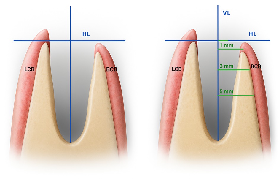 Figure 2. Measurement principle for socket preservation at multiple depths within the extraction site [adapted from (15)]: the distance between the lingual and buccal cortical bone is measured at 1 mm, 3 mm, and 5 mm apical depths relative to a horizontal reference line (HL) drawn on CBCT images. This line is defined by the most coronal point of the crestal bone and is oriented perpendicular to the vertical axis of the tooth. VL, vertical line (dental axis); HL, horizontal line; LCB, Lingual cortical bone; BCB, buccal cortical bone.