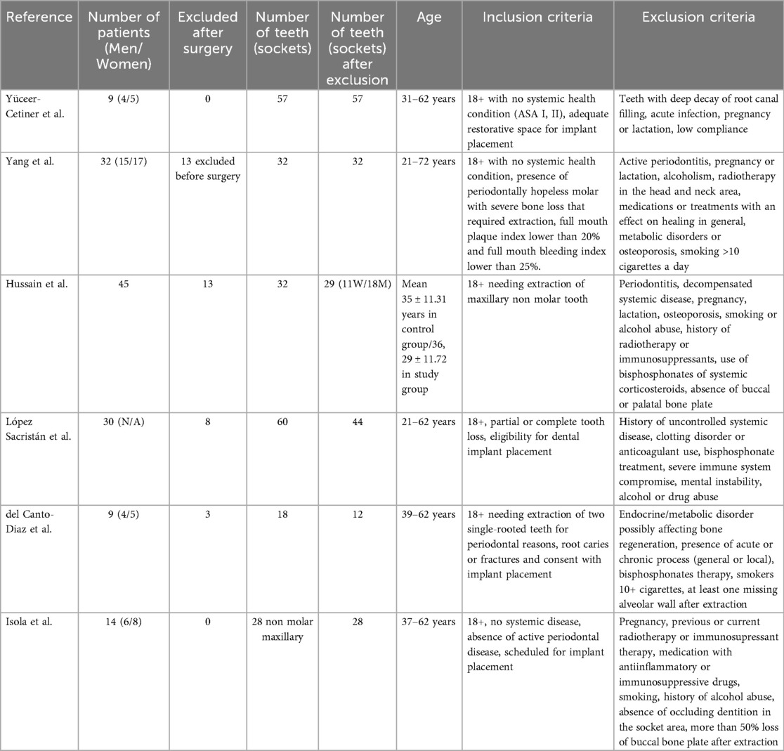 As this review aimed to evaluate the alveolar bone healing for prosthetic restoration, and third molars are typically not candidates for such restoration, studies on third molars were excluded from the search results. In addition, only clinical studies comparing a control group (spontaneous healing without augmentation) with a treatment group (autogenous dentin grafts) were included in the study. Only six publications met those final criteria and were selected for the review (15–20), see the PRISMA diagram in Figure 1.