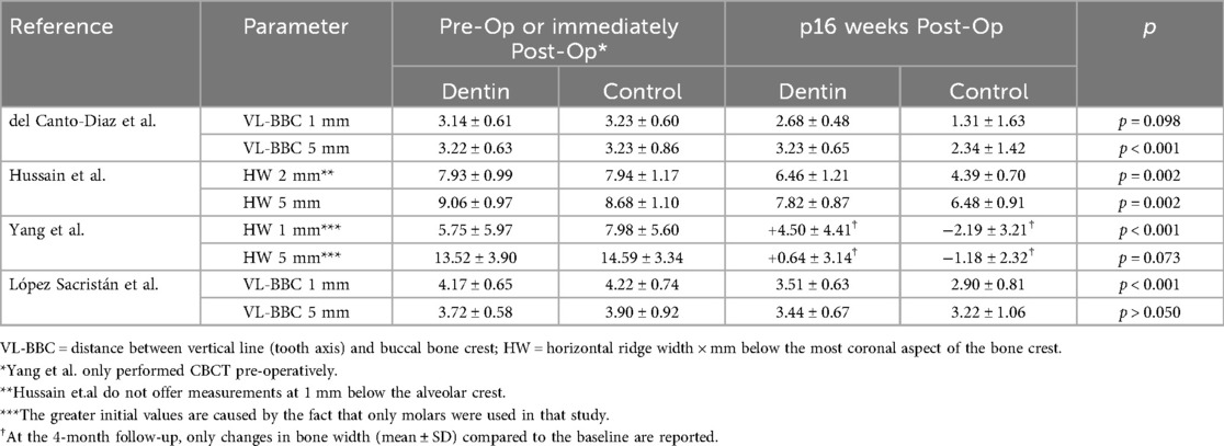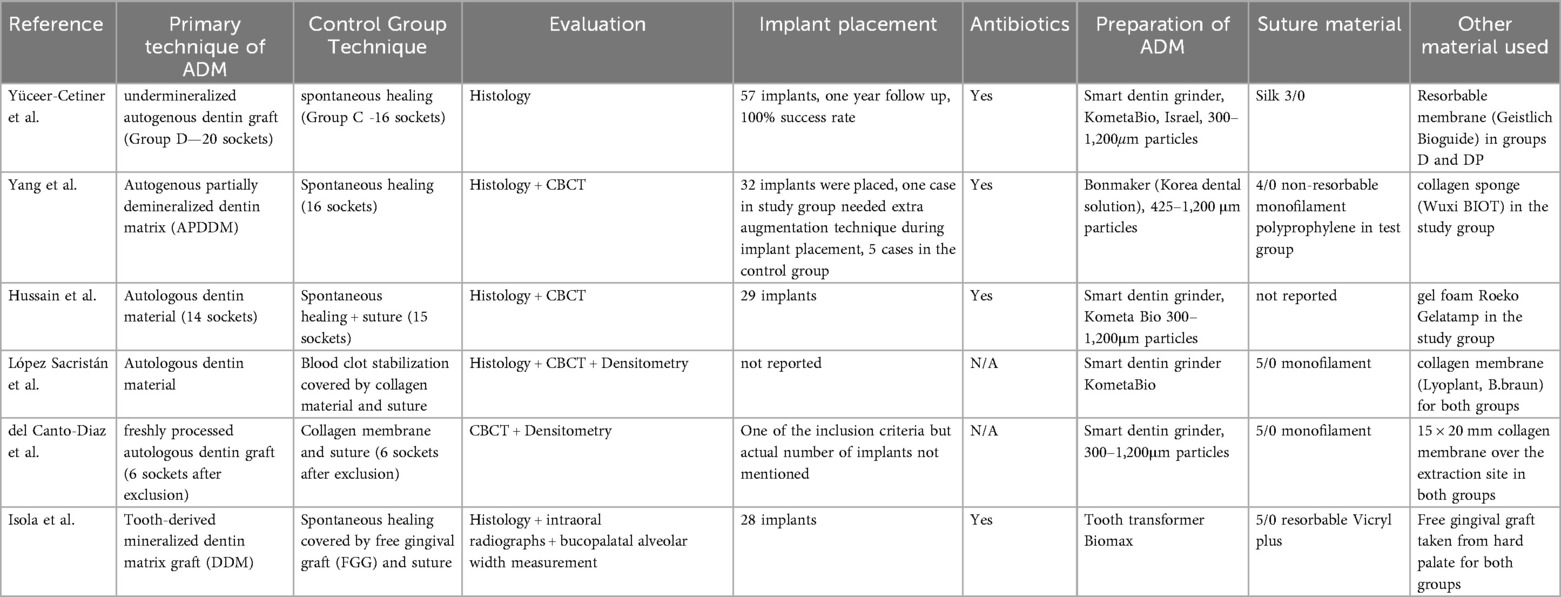 Yang et al. (17) were the only ones to use autogenous dentin from teeth with severe periodontal destruction (although in some cases, they supported it with dentin from another extracted tooth from the same patient). Their study focused exclusively on molar extraction sites. The experimental group received ADM grafts, while the control group was left to heal spontaneously, without any suturing or material placement. The evaluation was based on histological examination of samples harvested during implant placement and on the comparison of CBCT imagery immediately before extraction and 4 months after it (before implant placement). The results demonstrated a statistically significant difference in volumetric changes at the extraction site between groups, with the ADM group showing a greater volume of newly formed bone compared with the controls.