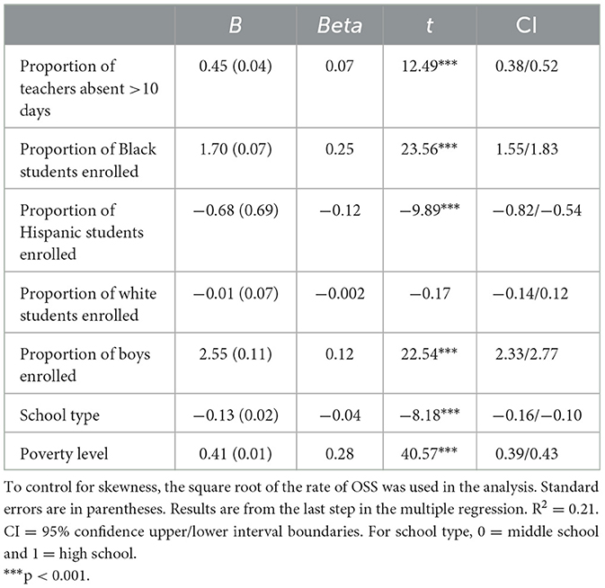 Our next step was to analyze data related to the primary goal of this research, namely, the degree to which the proportion of teachers was chronically absent, that is, for more than 10 days, predicted the use of OSS with students. To achieve this, we conducted a multiple linear regression in which the covariates (percentage of Black, Hispanic, white, and male students; poverty level; and school type) were entered first, followed by chronic teacher absence as predictors of the transformed rate of OSS. This analysis confirmed that chronic teacher absenteeism positively predicted greater rates of use of OSS above and beyond these covariates, (R2 = 0.21, R2 change for Steps 1 and 2 = 0.20 and 0.01, ps < 0.001, respectively). As can be observed in Table 3, chronic teacher absenteeism was significantly and positively related to the use of OSS after entering the covariates. Thus, schools with higher rates of teacher absenteeism were also likely to have higher rates of OSS. Examining the covariates revealed that schools with proportionately lower Hispanic student enrollment, higher Black and male student enrollment, higher poverty rates, and middle schools (relative to high schools) suspended students at higher rates (see Table 3).