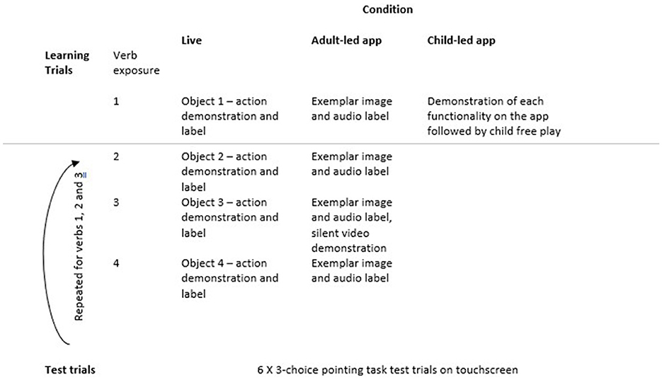 In the current study we asked whether children can learn verbs from touchscreen apps under child-led or adult-led co-use conditions, and in a live condition. Three-year olds were shown three novel verbs either on an app where the child led the app interaction or where the experimenter led the app interaction, or in a live interaction with the experimenter. Each novel verb was presented four times; twice in isolation and twice in intransitive sentences, and children were given the opportunity to watch a video clip in which the action was demonstrated. Verb learning was tested on the touchscreen tablet using a three-choice pointing task using the same images from the app conditions. Given that Naigles et al. (2005) showed that by 2 years of age, children can transfer novel verbs learnt in a live interaction to videos, we hypothesized that children in the live condition would perform above chance on the verb learning test. We therefore hypothesized that any difference in test performance between the live and app conditions would result from differences in learning. Children under the age of 3 years can only learn a novel verb from a video if it is supplemented with live interaction (Roseberry et al., 2014, 2009). Thus, we hypothesized that children in the child-led app condition would not show evidence of learning, while children in the adult-led app condition would show evidence of learning. Note that the age we selected is at the cusp of beginning to be able to learn verbs with and without social scaffolding (Roseberry et al., 2009) and so potentially able to highlight distinctions between learning from apps vs. live interactions.