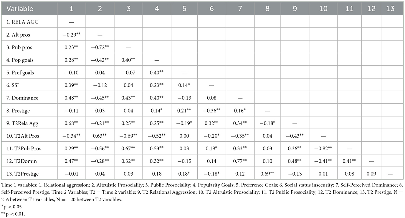 Correlations among the study variables can be found in Table 1 and were mostly as expected (selected correlations are reiterated here and in the next section). T1 popularity goals were positively related to T1 and T2 relational aggression and public prosociality and negatively related to T1 and T2 altruistic prosociality. T1 social preference goals were unrelated to T1 relational aggression and unrelated to T1 public and altruistic prosociality, unrelated to T2 prosocial behaviors, and negatively related to T2 relational aggression. T1 social status insecurity was positively related to T1 and T2 relational aggression, unrelated to T1 altruistic and public prosociality, positively related to T2 public prosociality and negatively to T2 altruistic prosociality.