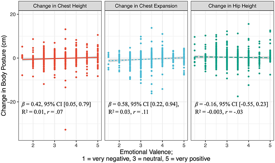 Figure 2. The relation between emotional valence and the change in children's chest height, chest expansion, and hip height. This figure was created with the package ggplot2 and the function stat_smooth (method = lm). Points represent data for individual children. Note that the measurement for the change in chest expansion is taken differently than for the change in chest height and hip height. On each panel we indicate the model estimate for emotional valence, associated 95% Confidence Interval, adjusted R2 of the model, and Pearson's correlation coefficient r.