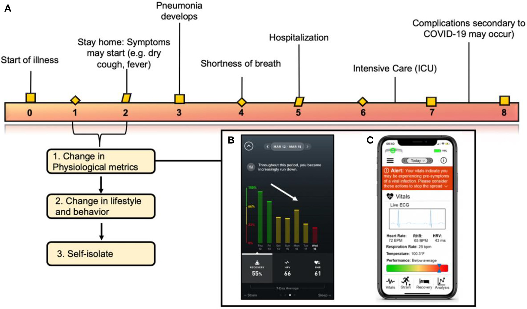 Correlating clinical symptoms to the immune response of COVID-19 and when the implementation of wearable technology fits into the virus timeline. (A) Correlating symptoms to the immunological pathway of COVID-19 described in this figure. Wearable sensors can be used to detect changes in physiological metrics before a formal diagnosis. (B) Image from the WHOOP application correlating a decrease in recovery with a diagnosis by an individual diagnosed with COVID-19 on Wednesday the 18th (red bar). (C) Schematic detailing an example of an iPhone application collecting physiological data from a wearable sensor and translating those metrics to alert an individual on his/her overall health status. Figure reproduced and modified from Azuravesta Design (10), (A) and Team (11), (B).