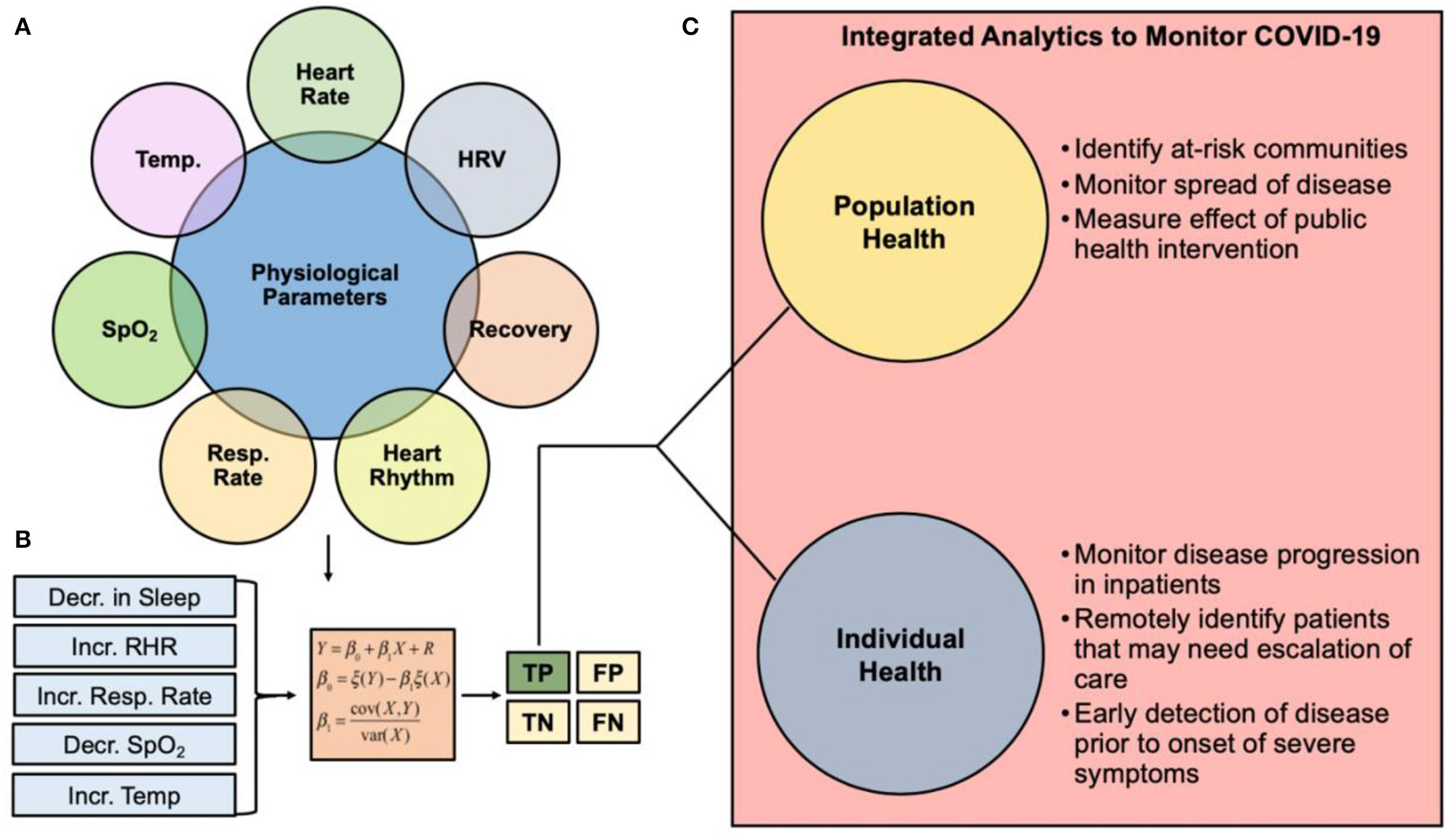 Clinical pathway summarizing the role of wearable sensor technology and predictive analytics for monitoring COVID-19. (A) Physiological metrics currently capable of being measured from commercial wearable sensors. (B) Changes in physiological metrics can be inputted into an early detection algorithm for COVID-19 monitoring. The goal of such algorithms is to ensure the true positive rate is robust to support the use of the analytics for real-time clinical decision making. (C) Integrated analytics to monitor COVID-19 can be used to monitor individual or population health. HRV, heart rate variability; Resp Rate, respiration rate; SpO2, blood oxygen saturation; Temp, temperature; TP, True Positive; FP, False Positive; TN, True Negative; FN, False Negative.