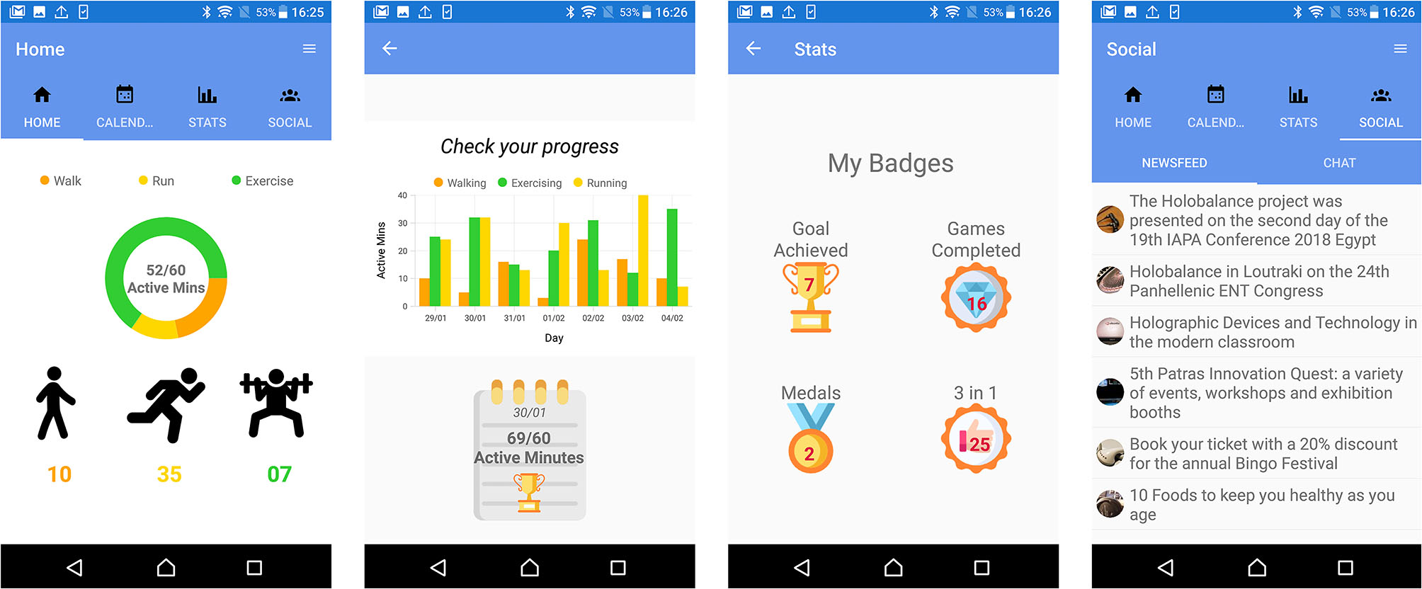 Determining the necessary functions and data that an application should contain is the first important step in creating a pleasant and meaningful user experience. This process is guided by the clarification of the target group and the main objectives of the application. The APA is aimed at adults over the age of 65 who suffer from balance disorders. Its main purpose is to offer patients with the capability to monitor their activity and have an overview of their progress resulting from their interaction with the components of the HOLOBALANCE platform. For that purpose, a number of functionalities regarding the display of information and the provision of education have been added. Through the smartphone application, users are enabled to keep track of the key elements regarding their activity recorded by an activity tracker, at any time of the day as well as of how close they are to achieving the goal set in their treatment plan. Social interaction functionalities were also determined as a powerful method for enhancing user health behaviors. The users of APA can communicate with other members of the HOLOBALANCE virtual community through the social interaction component of the application. They are informed about upcoming events and interesting issues and can exchange their ideas and concerns.